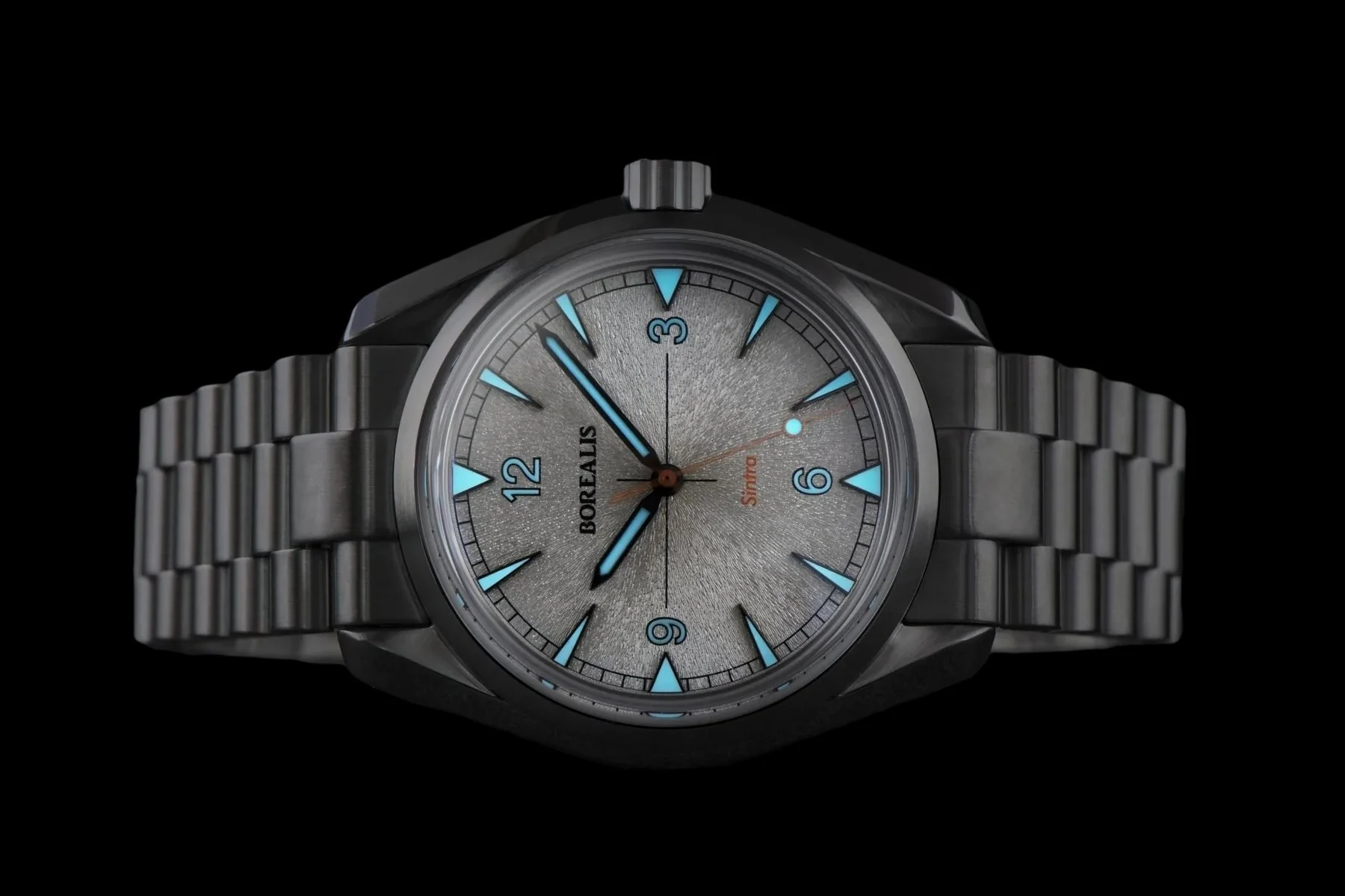 The dial, watch hands are made with thick Swiss Made RC Tritec BGW9 lume applied to it in order to guarantee a perfect illumination and easy readability in darkness.